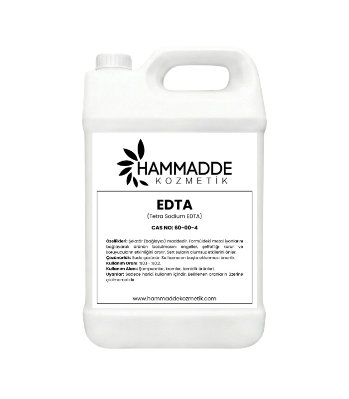 Özellikleri: Şelatör (bağlayıcı) maddedir. Formüldeki metal iyonlarını bağlayarak ürünün bozulmasını engeller, şeffaflığı korur ve koruyucuların etkinliğini artırır. Sert suların olumsuz etkilerini önler.