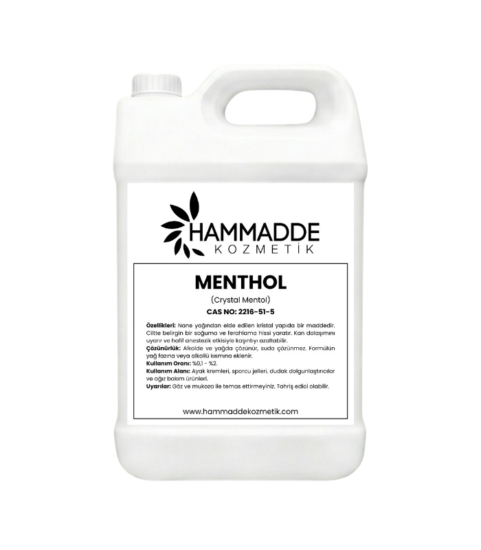 Özellikleri: Nane yağından elde edilen kristal yapıda bir maddedir. Ciltte belirgin bir soğuma ve ferahlama hissi yaratır. Kan dolaşımını uyarır ve hafif anestezik etkisiyle kaşıntıyı azaltabilir.