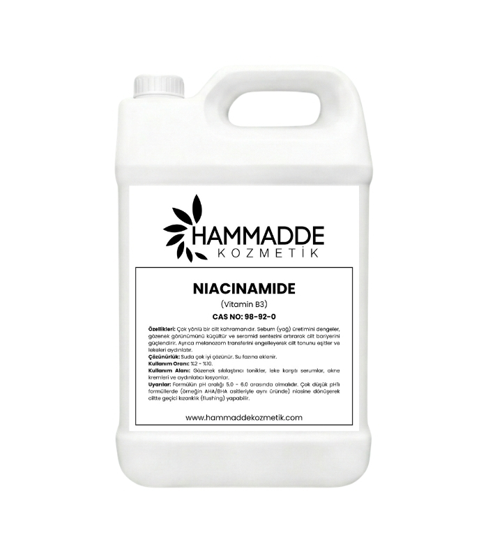 Uyarılar: Formülün pH aralığı 5.0 – 6.0 arasında olmalıdır. Çok düşük pH’lı formüllerde (örneğin AHA/BHA asitleriyle aynı üründe) niasine dönüşerek ciltte geçici kızarıklık (flushing) yapabilir.